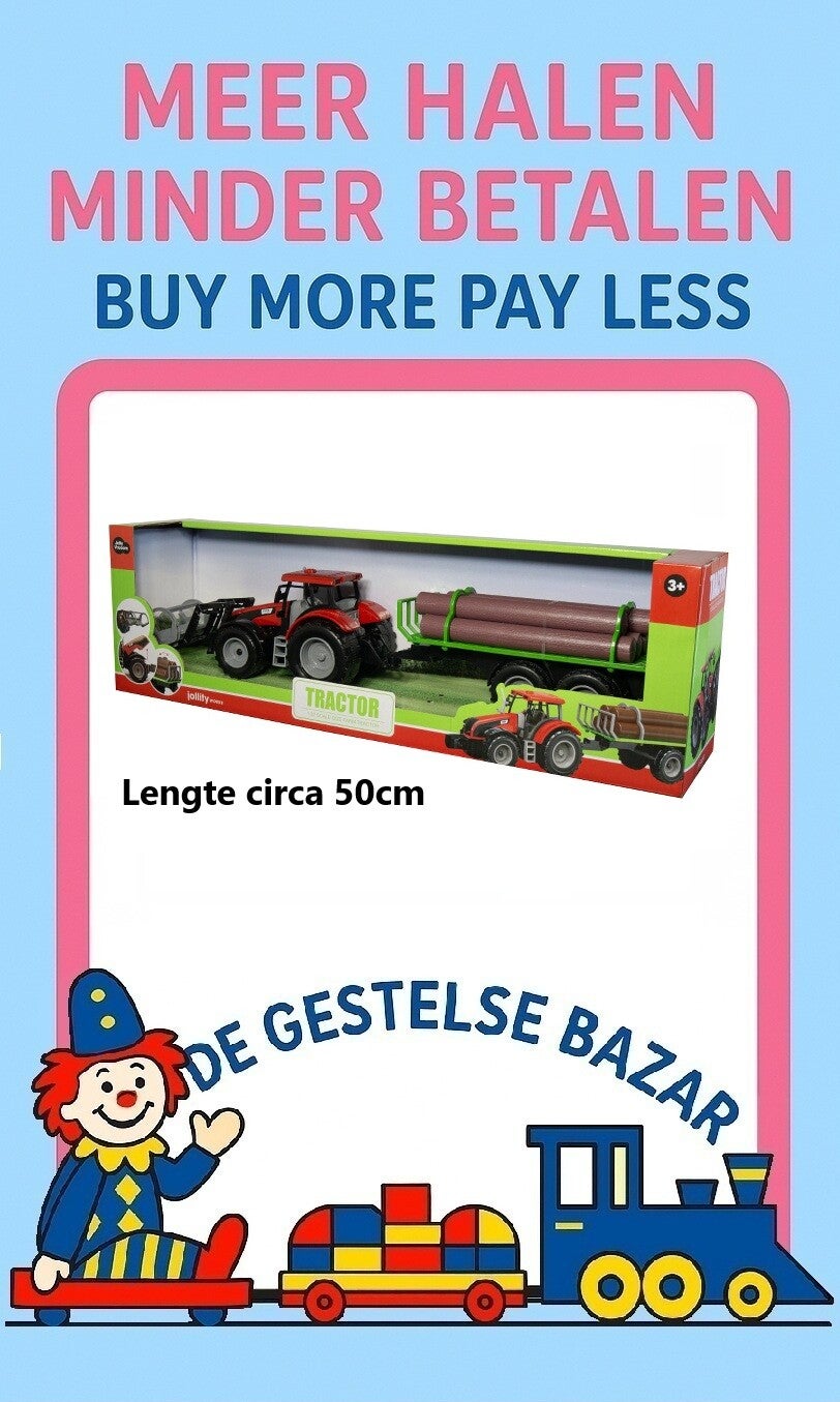Breng de magie van de boerderij tot leven met de JollyVroom rode tractor met aanhanger voor boomstammen! Deze felrode, plastic die-cast speelgoedtractor is perfect voor kleine avonturiers die houden van stoere voertuigen en boerderijwerk. Compleet met een afneembare aanhanger en realistische plastic boomstammen, biedt deze tractor eindeloos speelplezier voor kinderen die van ontdekken en bouwen houden.